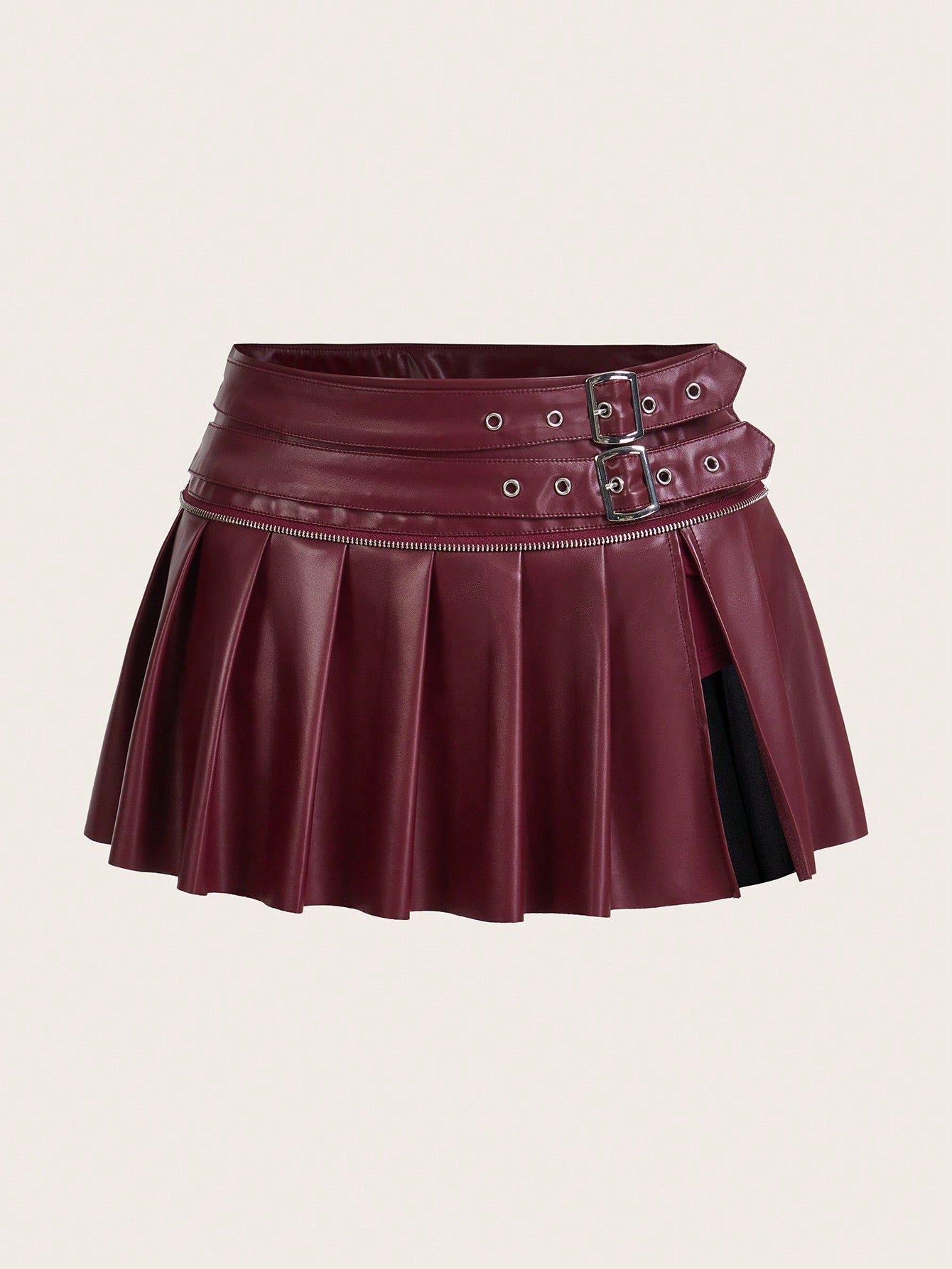👗 Falda corta a juego en el mismo material, con cinturón doble de hebillas metálicas.