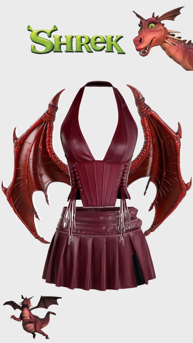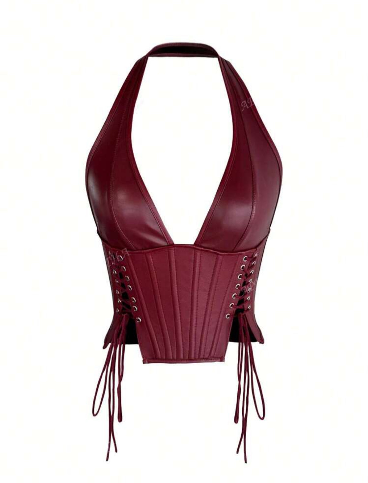👗 Vestido tipo corsé en cuero sintético rojo vino, con tirantes al cuello y ajustes laterales con cordones.
